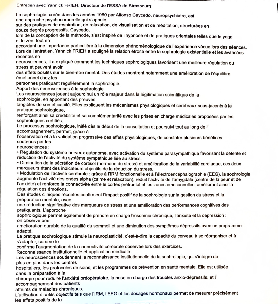 La prochaine session est programmée pour JANVIER 2026 à STRASBOURG...L'Ecole de Sophrologie Existentielle et de Sophrothérapie d'Alsace Yannick Frieh est Membre de la Société Française de Sophrologie (SFS). Membre de la Fédération Française de Psychothérapie et de Psychanalyse (FF2P), affiliée ISEBA Bordeaux, membre de l'Association Européenne de Psychothérapie (EAP). C'est pour cela qu'elle est accréditée pour accompagner les stagiaires à l'obtention du titre de sophrologue , de sophrologue-praticien et du titre de psycho-praticien en sophrologie existentielle (FF2P).